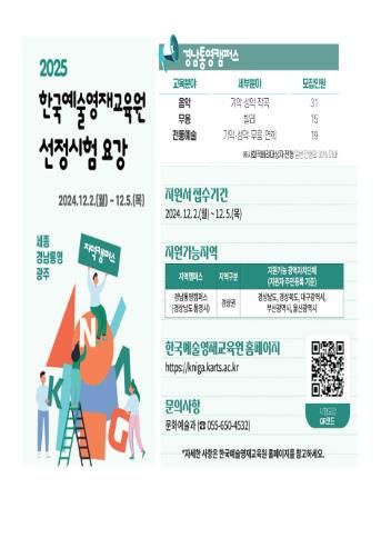 [경남도민뉴스=김부경 기자] 한국예술종합학교 한국예술영재교육원에서는 통영시 봉평동 소재 (구)신아SB 별관에 위치한 한국예술영재교육원 경남통영캠퍼스의 2025년도 교육생을 오는 12월 2일부터 5일까지 모집한다고 12일 밝혔다.