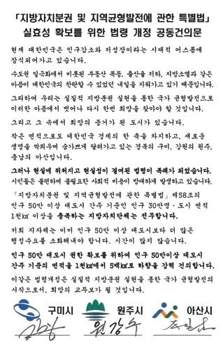 이번 건의문은 대도시 특례 기준 면적을 현행 1천㎢에서 5백㎢로 완화해 자치분권 실현을 통한 지방 균형발전을 강화하자는 세 도시의 의지를 담았다.
