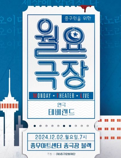 올 연말 중구민에게 특별한 경험을 선사할 ‘월요극장: 연극 테베랜드’의 티켓 오픈은 오는 18일 14시이며, 자세한 내용은 중구문화재단 홈페이지에서 확인할 수 있다.