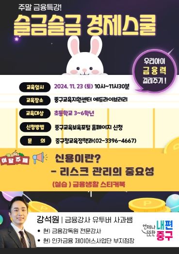 [경남도민뉴스=김완호 기자] 서울 중구가 11월 23일 토요일 10시부터 중구교육지원센터에서 관내 초등학교 3~6학년을 대상으로 주말 특강 ‘슬금슬금 경제스쿨’을 개최한다.