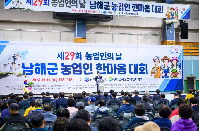 [경남도민뉴스=김부경 기자] 남해군은 지난 11일 남해실내체육관에서 군내 농업인 등 1,000여 명이 참석한 가운데 ‘제29회 농업인의 날 남해군 농업인 한마음대회’ 행사를 개최했다.