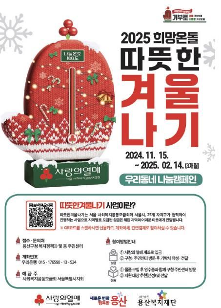 [경남도민뉴스=김완호 기자] 서울 용산구가 11월 15일부터 내년 2월 14일까지 3개월 동안 ‘2025 희망온돌 따뜻한 겨울나기’ 사업을 본격적으로 시작한다.