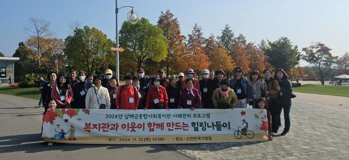 [경남도민뉴스=김부경 기자] 남해군 종합사회복지관은 지난 12일 순천만국가정원에서 사례관리대상자 30명과 직원 8명이 참여한 가운데 ‘복지관과 이웃이 함께 만드는 가을 나들이’를 개최했다.