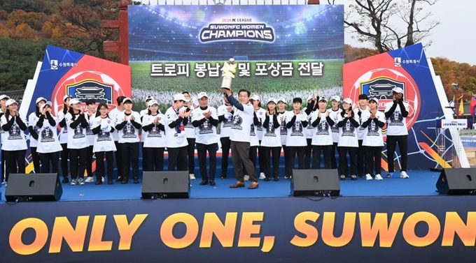 이날 행사는 수원시립합창단 공연, 이재준 시장 인사말, 선수단 소개, 우승트로피 봉납식, 포상금 전달, 우승 세레머니, 팬사인회 등으로 진행됐다.