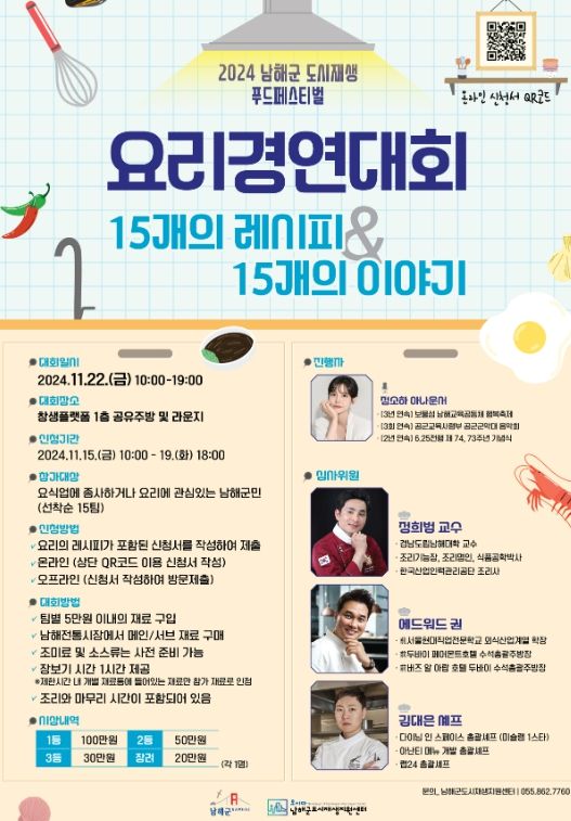 요리경연대회는 ‘15개의 레시피, 15개의 이야기’라는 주제로 열리며, 남해의 잊힌 맛과 남해의 새로운 맛을 동시에 찾아 나서는 시간이 될 것으로 기대된다.