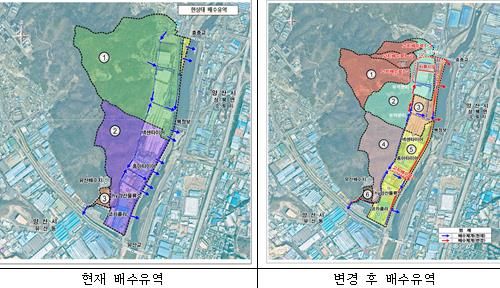사업구역의 우수배수 현황을 분석한 결과, 산지·농지·공업지역의 우수배제가 한 곳으로 집중되고 양산천 수위 상승 시 내수배제가 어려운 부분이 나타나는 것으로 분석됐다.