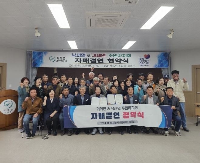 이날 협약식은 김종길 낙서면주민자치회장, 이광두 낙서면장, 윤성부 거제면주민자치회장, 곽성립 거제면장 등 양 기관·단체의 위원 및 공무원 등 40여 명이 참석했다.