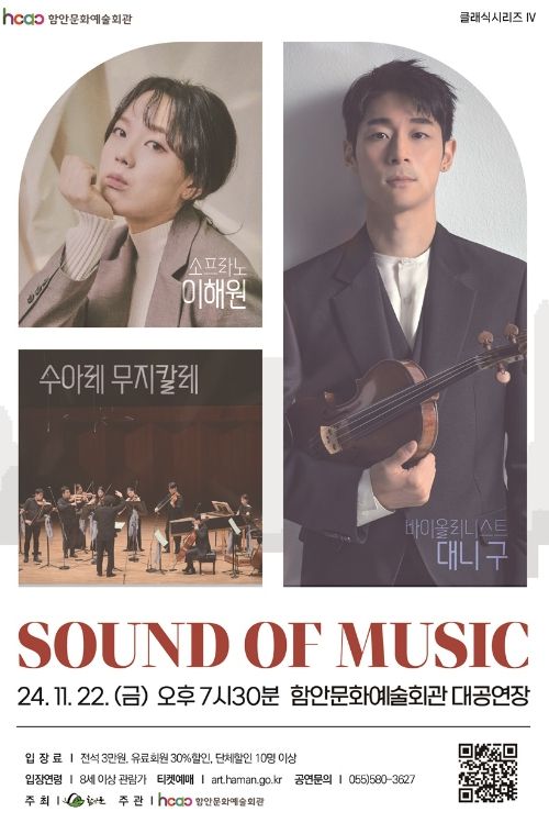 [경남도민뉴스=이상민 기자] 함안문화예술회관 대공연장에서 오는 22일 오후 7시 30분 바이올리니스트 ‘대니 구’와 소프라노 ‘이해원’, 스트링 체임버 앙상블 ‘수아레 무지칼레’가 함께하는 특별 공연 ‘사운드 오브 뮤직’이 열린다.