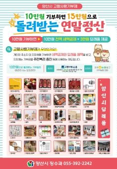 [경남도민뉴스=최미정 기자] 양산시는 다가오는 연말정산 기간을 맞아 고향사랑기부제에 시민들의 적극적인 참여를 독려하고 있다. 고향사랑기부제는 현주소지를 제외한 다른 자치단체에 기부금을 납부하면 10만 원까지 전액 세액공제, 10만 원 초과분에 대해 16.5%의 세액공제와 함께 기부금의 30% 이내의 답례품을 제공받는 제도로 작년 첫 시행 이후 점차 국민들에게 알려지고 있다.