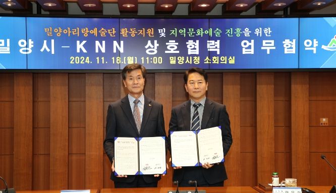 [경남도민뉴스=나희준 기자] 밀양시는 지난 18일 시청 소회의실에서 ㈜케이엔엔(대표이사 사장 이오상, 이하‘KNN’)과‘밀양아리랑예술단 활동 지원 및 지역 문화예술 활성화를 위한 업무협약’을 체결했다.