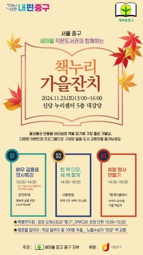[경남도민뉴스=김완호 기자] 서울 중구가 새마을 작은도서관과 함께 11월 23일 신당누리센터 대강당과 배움누리방에서 ‘책누리 가을잔치’를 개최한다.