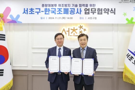 이날 서초구청에서 열린 협약식에는 전성수 서초구청장, 성창훈 한국조폐공사 사장 등 관계자들이 참석해 협약서 서명, 기념 촬영 및 기념품 교환을 진행하였다.
