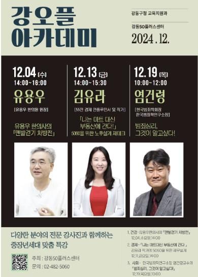[경남도민뉴스=김완호 기자] 강동구는 중장년 세대를 위한 명사 초청 특강 시리즈 ‘강오플아카데미’를 강동50플러스센터에서 내달 운영한다고 22일 밝혔다. 특강 신청은 11월 27일부터 강동50플러스센터 누리집(홈페이지)에서 온라인으로 할 수 있다.