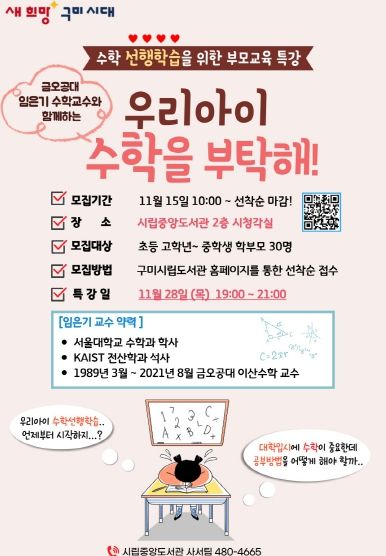 [경남도민뉴스=이돈휘 기자] 구미시립중앙도서관은 오는 28일 오후 7시부터 9시까지 중앙도서관 2층 시청각실에서 부모교육 특강 ‘우리아이 수학을 부탁해!’를 개최한다.