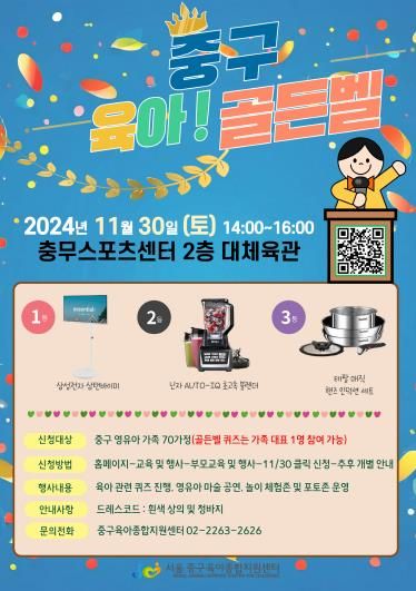 [경남도민뉴스=김완호 기자] 서울 중구가 오는 11월 30일 오후 2시부터 4시까지 충무스포츠센터 2층 대체육관에서 ‘2024 중구 육아 골든벨’을 개최한다.