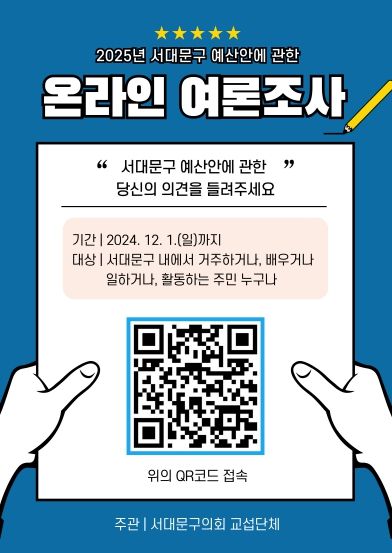 [경남도민뉴스=김완호 기자] 서대문구의회 서호성 의원은 '2025년도 서대문구 예산안'에 대해 온라인 여론조사를 실시한다고 밝혔다.