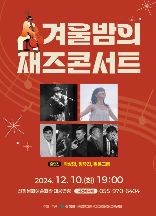 권순혁 산청군 문화체육과장은 “산청문화예술회관은 수준 높은 문화 예술 공연으로 지역 문화의 활성화를 도모하고 있다”며 “겨울을 맞아 따뜻하고 감동적인 음악과 더불어 재즈의 매력에 빠져보길 바란다”고 말했다.