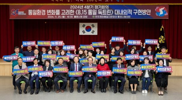 [경남도민뉴스=김부경 기자] 민주평화통일자문회의 통영시협의회(협의회장 이재동)는 지난 25일 통영시청 강당에서 천영기 통영시장, 자문위원 등 30여 명이 참석한 가운데‘통일환경 변화를 고려한 '8.15 통일 독트린' 대내외적 구현방안’을 주제로 2024년 4분기 정기회의를 개최했다.