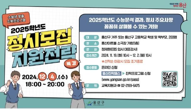 수능 성적 발표 이후에는 정시 합격 가능성을 높이기 위해 ‘2025학년도 정시대비 1:1 전략컨설팅’을 실시한다. 내달 21일 용산꿈나무종합타운(백범로 329) 원어민외국어교실에서 열린다.