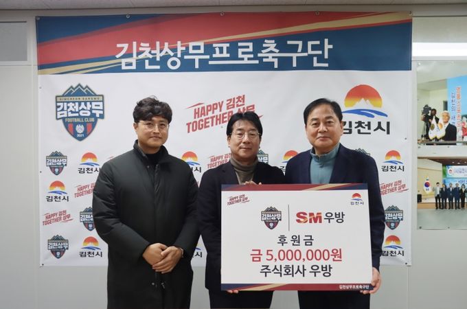 김천상무프로축구단이 11월 22일, 김천종합운동장에서 주식회사 우방과 후원금 전달식을 진행했다. 행사에는 주식회사 우방 구군모 기술본부장과 관계자, 김천상무 배낙호 대표이사가 참석했다.