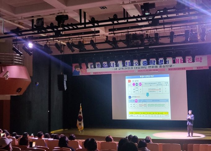 [경남도민뉴스=나희준 기자] 밀양시는 지난 26일 밀양시청소년수련관 강당에서 지역 내 중학생, 학부모 200여 명을 대상으로 2028 대입 개편안 대비를 위한‘대학입시의 변화와 중학생의 대비 전략 입시설명회’를 개최했다.