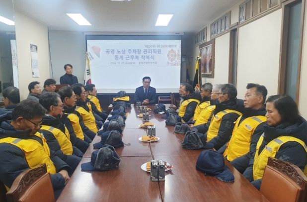 [경남도민뉴스=장광동 기자] 진병영 함양군수는 11월 27일 오전, 함양군 재향군인회에서 위탁 운영 중인 함양읍 공영(노상)주차장 관리원 동계 단복 착복식에 참석해 관리원들을 격려했다.
