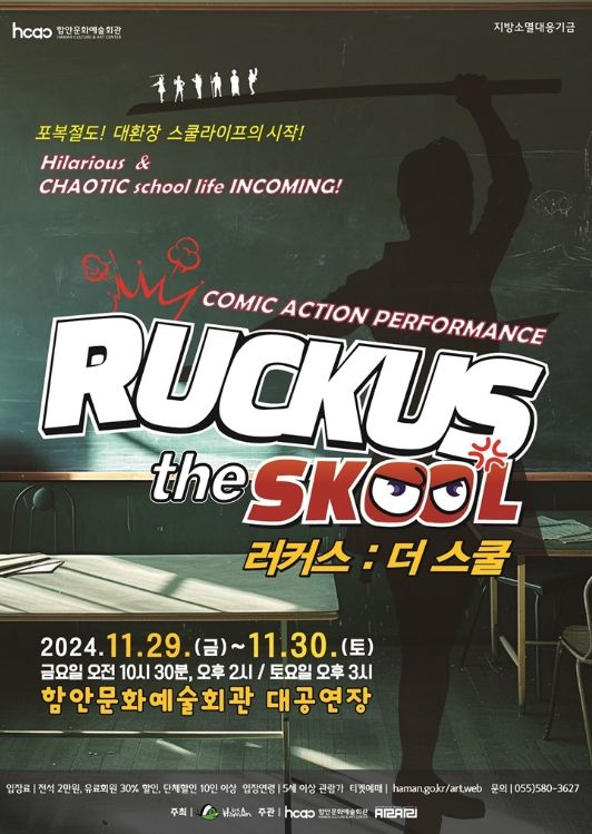 [경남도민뉴스=이상민 기자] 함안문화예술회관은 지방소멸대응기금을 활용해 ‘문화예술공연과의 만남’ 사업의 일환으로 넌버벌 코믹극 ‘러커스 더 스쿨’ 공연을 오는 29일 금요일~30일 토요일 2일간 총 3회에 걸쳐 함안문화예술회관 대공연장에서 선보인다.