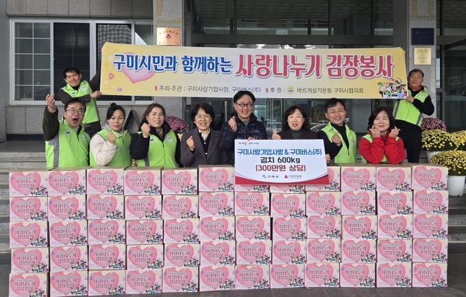 구미사랑기업사랑과 구미버스㈜는 2021년부터 김장김치를 마련해 지역 내 저소득 가구를 지원하고 있다. 이번 김장은 구미사랑기업사랑 회원들과 바르게살기운동 구미시협의회 회원들의 손길로 완성됐으며, 준비된 김치는 저소득 취약계층 60세대에 전달된다.