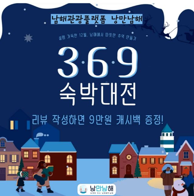369 숙박대전은 낭만남해에서 12월 한달 동안 숙소를 예약하고 숙박을 완료한 회원들 대상으로, 예약금액에 따라 캐시백을 지급하는 방식으로 진행된다.