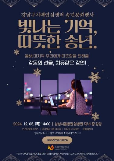 [경남도민뉴스=김완호 기자] 꿈이 모이는 도시, 미래를 그리는 강남구의 치매안심센터가 오는 12월 5일 오후 2시부터 4시까지 삼성서울병원 지하 1층 강당에서 송년 문화행사 ‘빛나는 기억, 따뜻한 송년’을 개최한다.