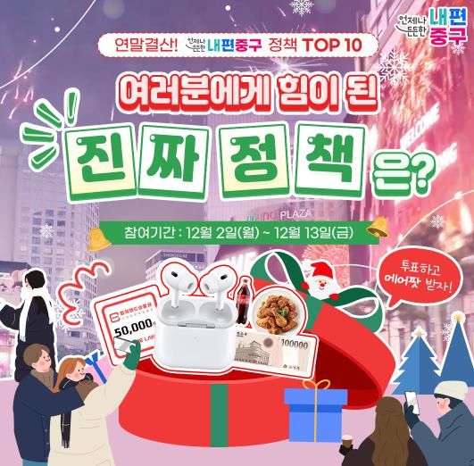 투표는 중구의 공식 플랫폼‘온통중구’를 통해 누구나 참여할 수 있다. 참여자 중 106명을 추첨해 다양한 경품을 증정할 예정이다. 무선이어폰(1명), 10만 원 상당 백화점 상품권(2명), 5만 원 상당 문화상품권(3명), 치킨 기프티콘(100명)이 경품으로 준비돼 있다.