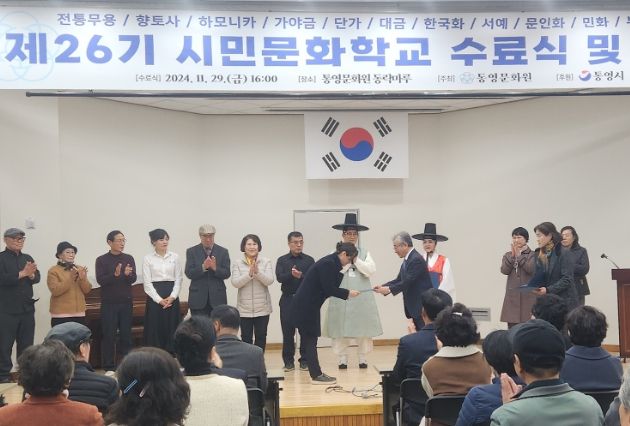이날 행사에는 조형호 통영시 부시장과 배도수 통영시의회의장을 비롯한 시의원, 문화학교 수료생과 가족회원 등 100여명이 참석했다.