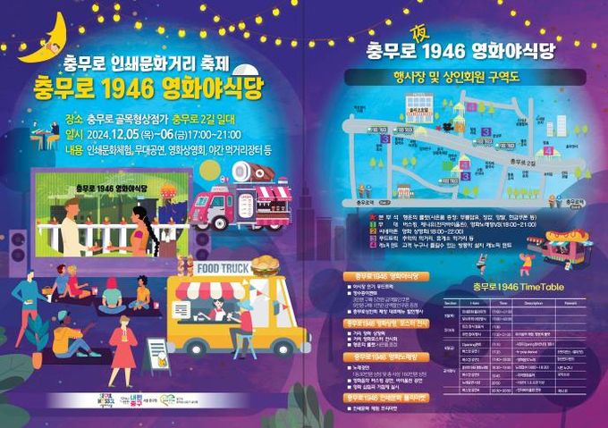 오는 12월 5일과 6일 충무로 인쇄문화거리(충무로2길 일대)에서 ‘충무로 1946 영화야(夜)식당’축제가 열린다. 축제는 이틀간 저녁 5시부터 9시까지 충무로 골목형상점가 상인회의 주관으로 진행된다.