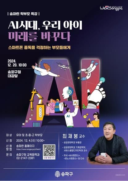 [경남도민뉴스=김완호 기자] 송파구가 오는 20일 10시 구청 대강당에서 ‘AI시대, 우리아이 미래를 바꾸다’를 주제로 학부모 특강을 개최한다고 알렸다.