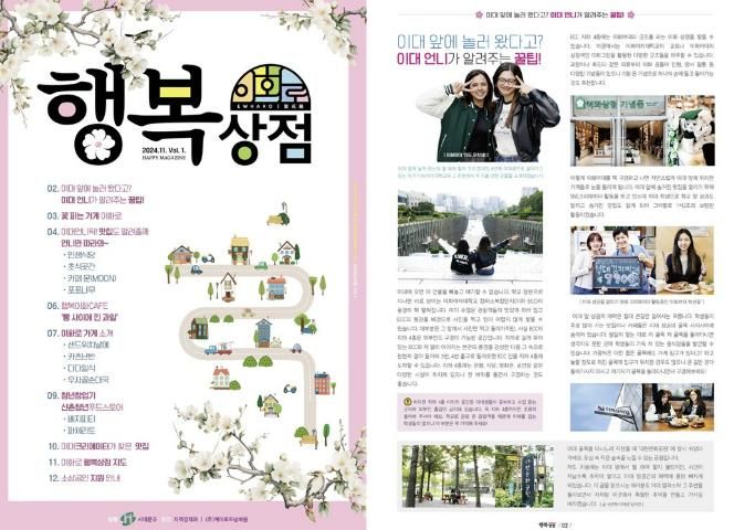 ‘행복상점’은 이대 상권의 특색 있는 가게를 알리는 12쪽 분량의 소책자로 ▲이대 상권 소개 ▲이대생 추천 맛집 ▲상인들의 이야기 ▲행복상점지도 등의 내용으로 구성돼 있다.