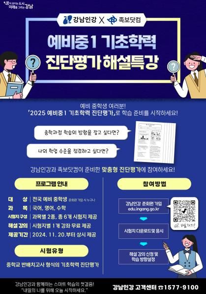 [경남도민뉴스=김완호 기자] 꿈이 모이는 도시, 미래를 그리는 강남구가 족보닷컴과 손잡고 오는 전국 예비 중학생을 대상으로 ‘2025 예비 중1 기초학력 진단평가 해설특강’을 제공한다.