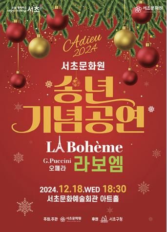 전성수 서초구청장은 “지난 여름 ‘썸머 클래식판타지: 오페라 나비부인’에 보내주신 뜨거운 성원에 힘입어 이번 ‘Adieu `2024, 송년기념공연: 오페라 라보엠’으로 다시 한번 감동을 나누고자 한다.”며 “사랑하는 가족, 친구들과 함께 크리스마스의 설렘과 연말의 따뜻한 정서를 느낄 수 있는 자리가 되길 바란다.”고 말했다.