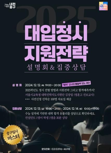 [경남도민뉴스=김완호 기자] 서울 중구가 12월 12일(목) 중구교육지원센터 지하 1층 에듀라이브러리에서 관내 수험생과 학부모 150명을 대상으로 ‘2025학년도 대입정시 지원전략’ 설명회를 개최한다.