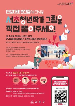 이번 투표에는 서초청년갤러리 사업 참여 작가 15명이 50개 작품을 출품했다. 투표 참여자는 50개 작품 중 마음에 드는 그림을 최대 5개까지 고를 수 있고, 최종적으로 투표 순위 1위부터 19위까지가 반포대로 분전함에 전시될 예정이다. 서초구청 홈페이지나 포스터의 QR코드를 통해 투표할 수 있고, 기한은 이달 15일까지다.
