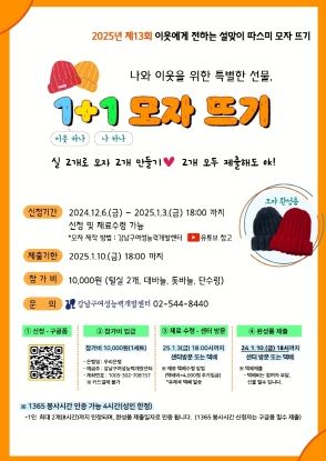 [경남도민뉴스=김완호 기자] 꿈이 모이는 도시, 미래를 그리는 강남구가 주민들이 직접 만든 털모자를 어르신과 장애인 등 소외계층에게 전달하는 ‘따스미 모자 뜨기’ 행사를 12월 6일부터 1월 10일까지 진행한다. 행사에 참여할 참가자는 1월 3일까지 모집한다.