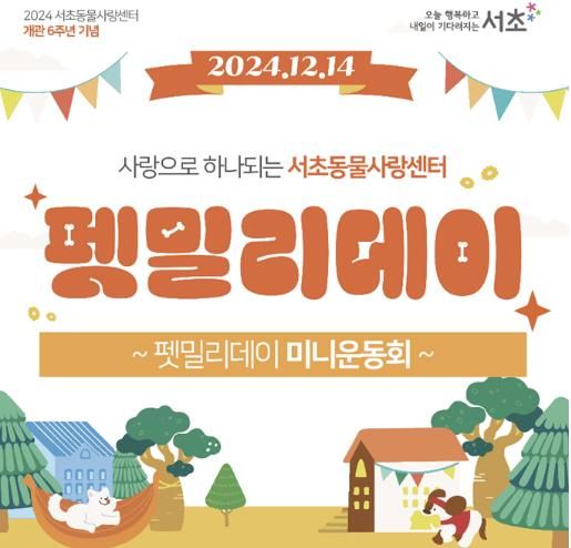 [경남도민뉴스=김완호 기자] 서울 서초구가 오는 14일 2시 구청 2층 대강당에서 서초동물사랑센터 개관 6주년을 기념해 반려견 입양 가족들이 사랑으로 하나 되는 ‘펫밀리데이(Pet+Family)’ 행사를 개최한다고 밝혔다.
