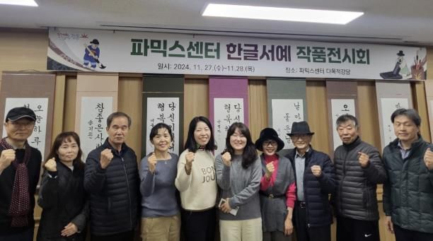 파믹스센터 로비에는 한글 서예 교실 수강생들의 한글 서예 작품 12점이 전시되어 방문객들을 맞이하고 있다. 지난 5월~11월 파믹스센터 한글 서예 교실 프로그램 강사와 참여자들의 작품들이다. 앞서 11월 27일~28일 진행한 서예 작품 전시회가 방문객들의 좋은 반응을 얻어 연말까지 센터 내부에 전시하기로 한 것이다.