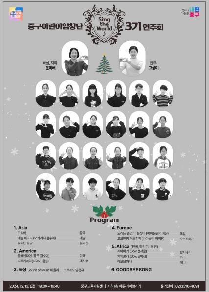 [경남도민뉴스=김완호 기자] 서울 중구가 12월 13일 금요일 저녁 중구교육지원센터 지하 1층 에듀라이브러리에서 중구 어린이합창단 3기 연주회를 개최한다.