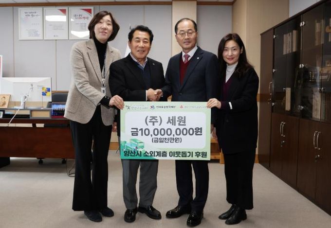 이날 기탁식에 참석한 ㈜세원 김창호 대표는 “우리 회사는 양산시민의 발이 되려고 노력하고 있다”며 “앞으로도 성금 기탁을 포함해 지역 발전을 위해 기여하기 위해 꾸준히 노력하겠다”고 소감을 밝혔다.