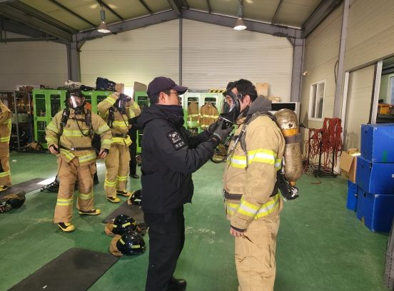 훈련은 현장 실습 중심으로 진행됐으며, 주요 내용으로는 ▲ 환자 평가 및 응급처치 ▲ 공기호흡기 착용, 소방호스 전개 및 회수 ▲ 지하 농연 내 비상탈출 ▲ 로프매듭 및 구조장비 활용 등 현장에서 바로 활용할 수 있는 교육으로 진행됐다.