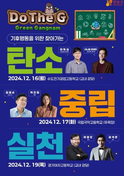 [경남도민뉴스=김완호 기자] 꿈이 모이는 도시, 미래를 그리는 강남구 탄소중립 실천 확산을 위해 관내 고등학교를 직접 찾아가는 ‘Do The G(Green Gangnam)’ 특강을 개최한다. ▲16일 오후 2시 수도전기공업고등학교 ▲17일 오전 10시 40분 국립국악고등학교 ▲19일 오전 9시 경기여자고등학교에서 진행된다.