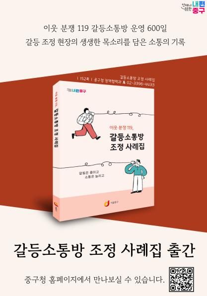 [경남도민뉴스=김완호 기자] 서울시 자치구 최초로 갈등관리팀을 신설하고 갈등소통방을 운영하며 이웃 간 분쟁 해결에 앞장서 온 서울 중구(구청장 김길성)가 ‘갈등소통방 조정 사례집’을 발간했다.