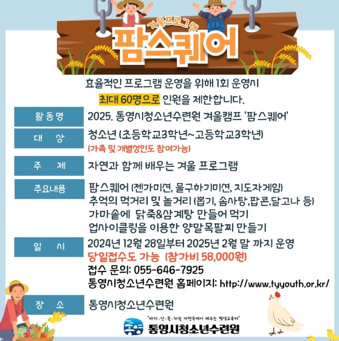 [경남도민뉴스=김부경 기자] 통영시청소년수련원에서는 겨울방학을 맞이해 오는 28일부터 2025년 2월말까지 통영시청소년수련원에서 청소년들이 또래와 어울리며 농업 문화 등을 체험하는‘팜스퀘어(farm square)’프로그램을 실시한다고 12일 밝혔다.