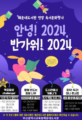 [경남도민뉴스=신석주 기자] 부산광역시립해운대도서관은 오는 14일부터 본관 1층 로비 및 어린이실에서 어린이와 청소년, 도서관 이용자를 대상으로 연말 독서문화행사 '안녕! 2024, 반가워! 2025'를 운영한다. 이번 행사는 한 해 동안 학업과 자기 계발에 힘쓴 어린이·청소년들에게 의미 있는 연말을 선물하고, 2025년에도 도서관과 함께하는 풍성한 한 해를 보낼 수 있도록 응원하기 위한 것이다.