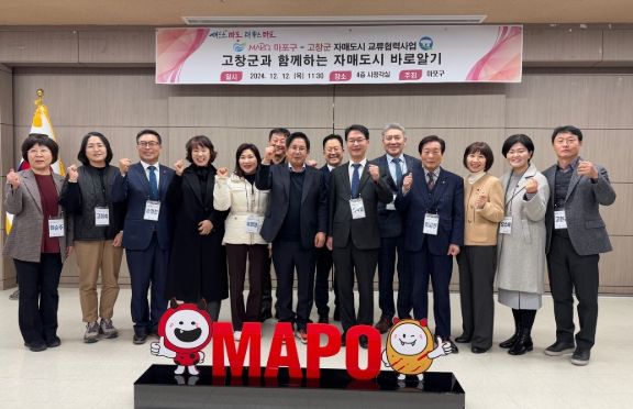 [경남도민뉴스=김완호 기자] 박강수 마포구청장은 12월 12일 오전, ‘자매도시 바로알기’ 교류협력사업으로 마포구를 방문한 심덕섭 고창군수와 군민을 반갑게 맞이했다.